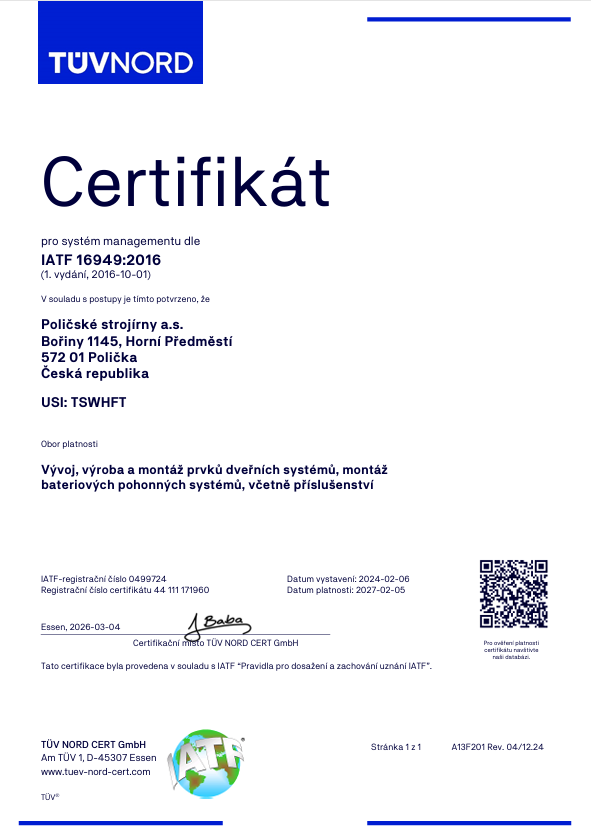 - The company “Poličské strojírny a.s.” has an implemented, maintained and documented Integrated Quality Management System meeting the requirements of EN ISO 9001:2015, EN ISO 14001:2015, AQAP 2110 (ČOS 051622). The IATF 16949:2016 standard has been introduced for the development and production of pneumatic elements.